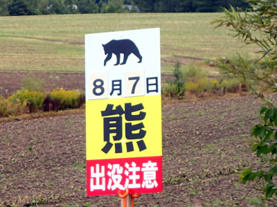 写真は2017年に美瑛/富良野を走った時、道端に立っていた看板ですが、それ以外でも何回か熊出没の看板を見かけました。